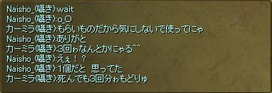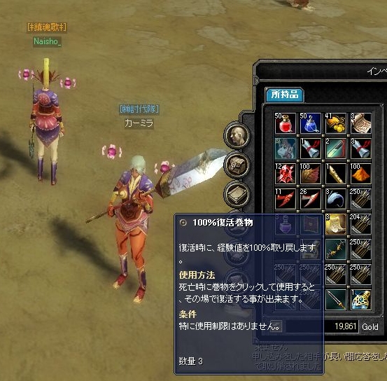 補充せずに出てきたよーです。温泉沸かして座り込み、どーしようか一思案。帰還書はあと1枚。馬は連れてきていません。それに出てきて30分も経っていません。で、ギルメンに配達して貰おうと橙茶で叫びます。Naisho_(ギルド):青歩切れた